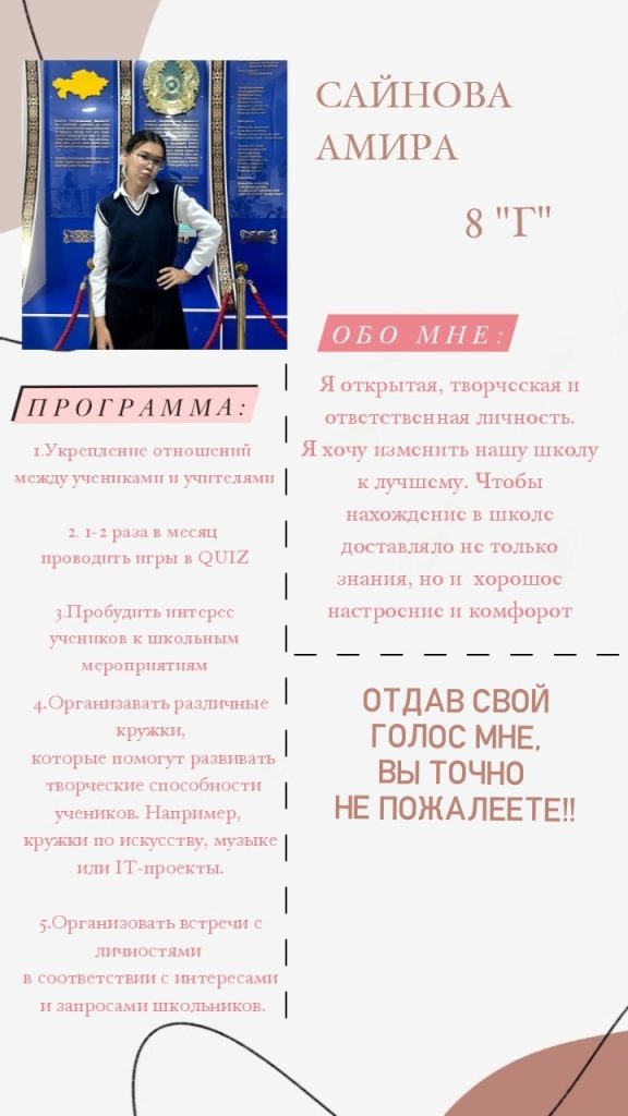 🛑#7 үміткер — 8 «Г»- сынып оқушысы Сайнова Амира