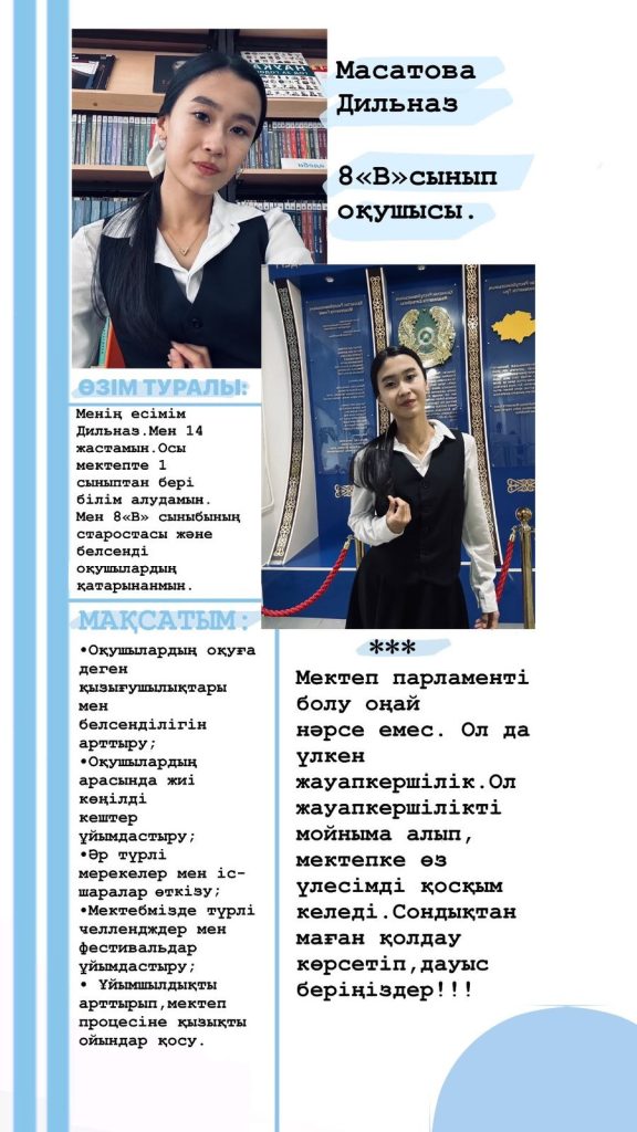 🛑#4 үміткер — 8 «В»- сынып оқушысы Масатова Дильназ